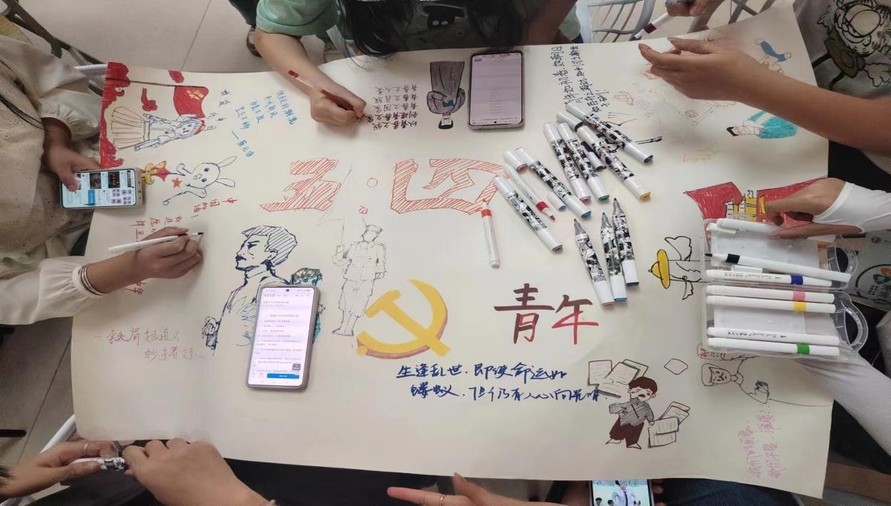 在活动上,同学们积极创作,绘画出自己心中的青春,展现出自己的青春气息,在相互帮助中同学们组成小组,在一张纸上绘出了自己所认为的五四青年之气,彩绘出自己的青春。